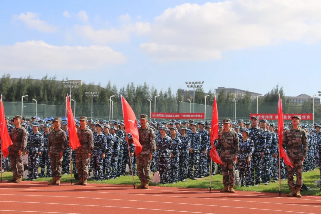 王定福向朱智青授军训团团旗,裘俞涛向各营长授营旗,标志着2025级学生军训正式启动。