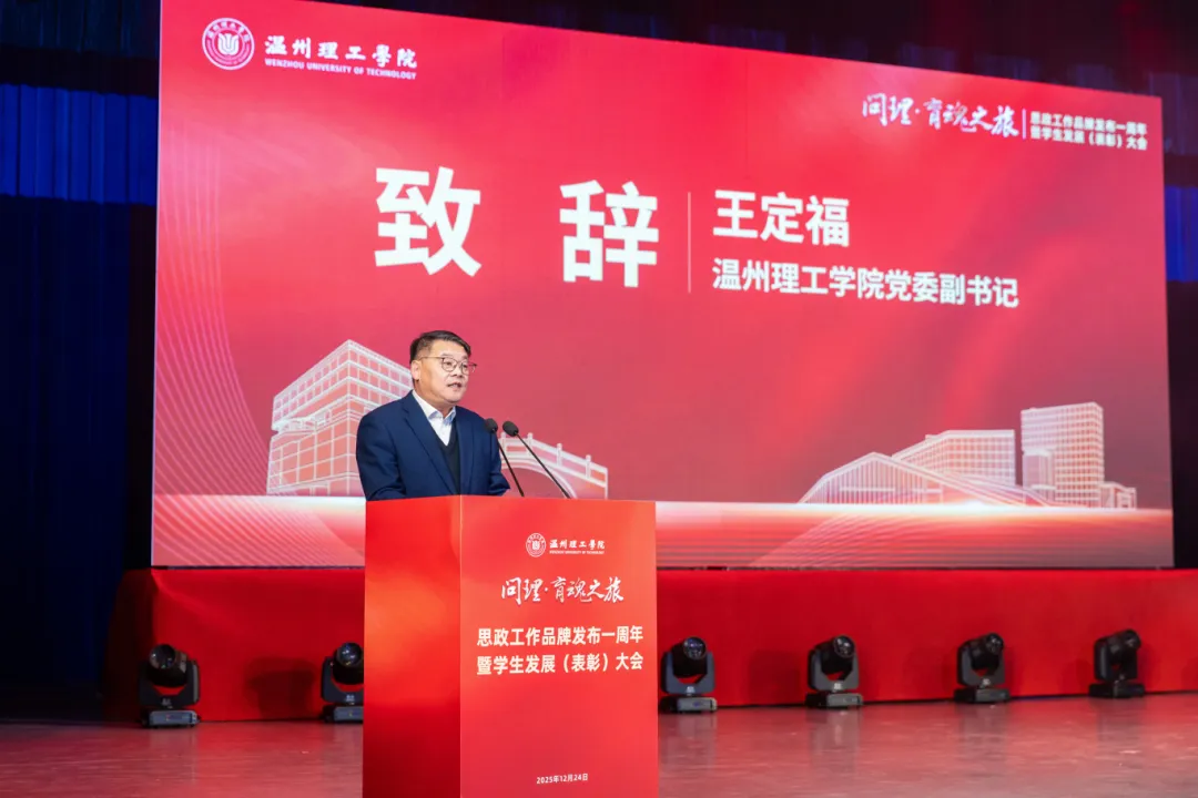 12月24日,温州理工学院举行“问理·育魂之旅”思政工作品牌发布一周年暨学生发展(表彰)大会。校长周文龙,党委副书记王定福,副校长孙芙蓉,党委委员、宣传部部长、统战部常务副部长林盛光等校领导,各职能部门与二级学院负责人、班主任代表、辅导员及获奖学生代表共聚一堂,回顾品牌建设一周年的丰硕成果,表彰在思想引领、学业科研、创新创业、社会实践等方面表现突出的先进集体与个人。