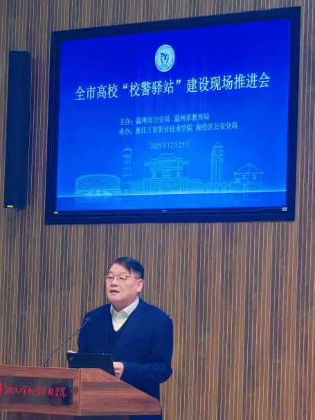 12月25日,温州市高校校警驿站建设现场推进会在浙江工贸职业技术学院召开。温州市副市长、公安局局长毛伟平出席会议并讲话。我校党委副书记王定福作典型发言,介绍高校校警驿站建设的“温理工方案”。