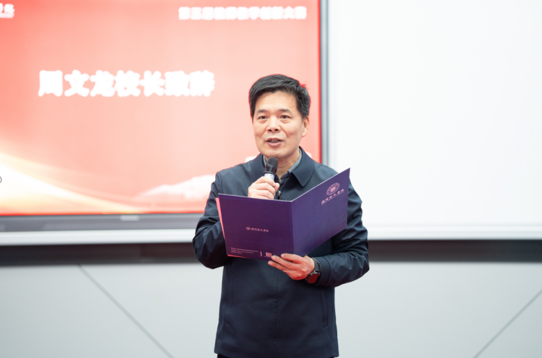 校长周文龙在致辞中指出,教学创新是推动高等教育高质量发展的核心引擎。全国教育工作会议提出的 “持续推进国家教育数字化战略” 为高校教学创新指明了方向。近年来,我校在教育教学改革方面成效显著,本次大赛正是学校深化教学改革、提升教师创新能力的重要举措。他鼓励全体教师以大赛为契机,坚守教学初心,深耕创新实践,将技术赋能与教学常规有机结合,培养具有国际视野、创新精神和实践能力的应用型人才。