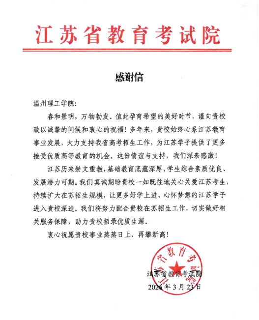 近日,我校接连收到多个省份教育考试院的感谢信,既是对我校近年招生工作的高度肯定,也是省际教育协作的见证,是全体温理工师生实干担当的回馈,更是我校招生工作稳步提质的生动缩影。