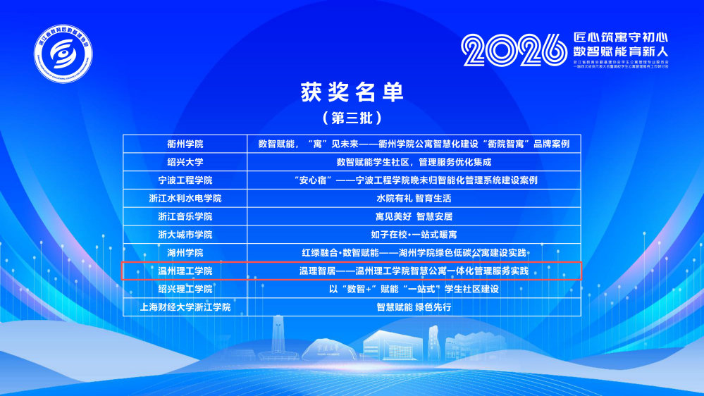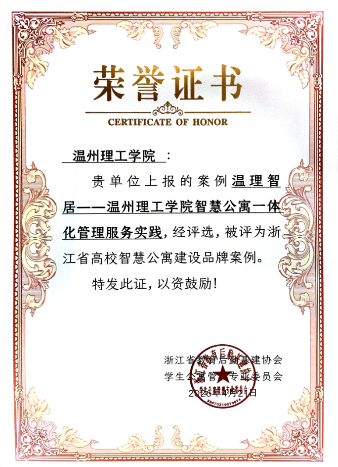 近日,在浙江省教育后勤基建协会学生公寓管理专业委员会组织的评选活动中,我校报送的《温理智居——温州理工学院智慧公寓一体化管理服务实践》成功入选2026年浙江省高校公寓智慧建设获奖案例,与省内多所高校一同登上荣誉榜单!