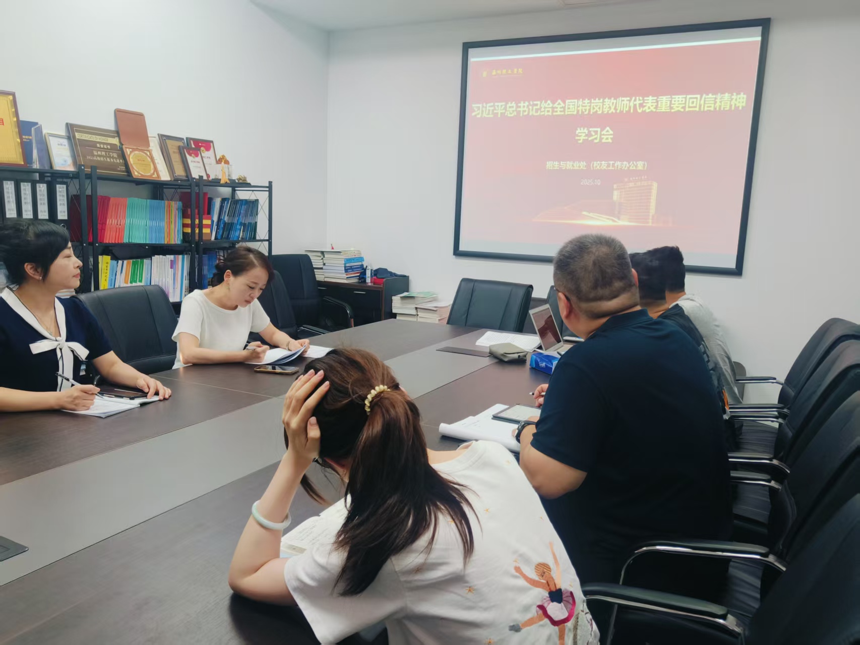 为深入学习领会习近平总书记给全国特岗教师代表重要回信精神,切实将精神力量转化为推动工作的强大动力,10月10日下午,招生与就业处(校友工作办公室)在行政楼B715会议室召开专题学习会。