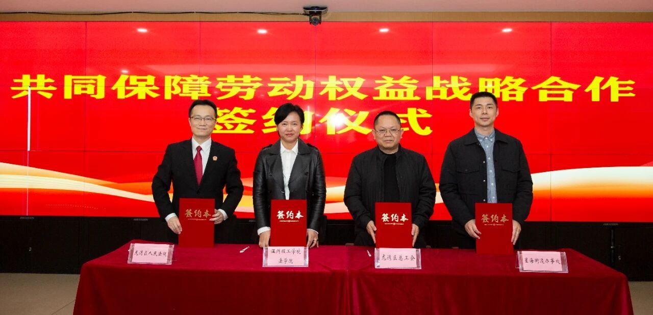 活动现场,温州理工学院法学院副院长朱美宁对中心情况进行了全面介绍,龙湾区总工会、龙湾区法院、星海街道办事处与温州理工学院法学院共同签署了劳动权益保障战略合作协议,四方携手构建联动机制,为织密园区职工服务网络奠定坚实基础。
