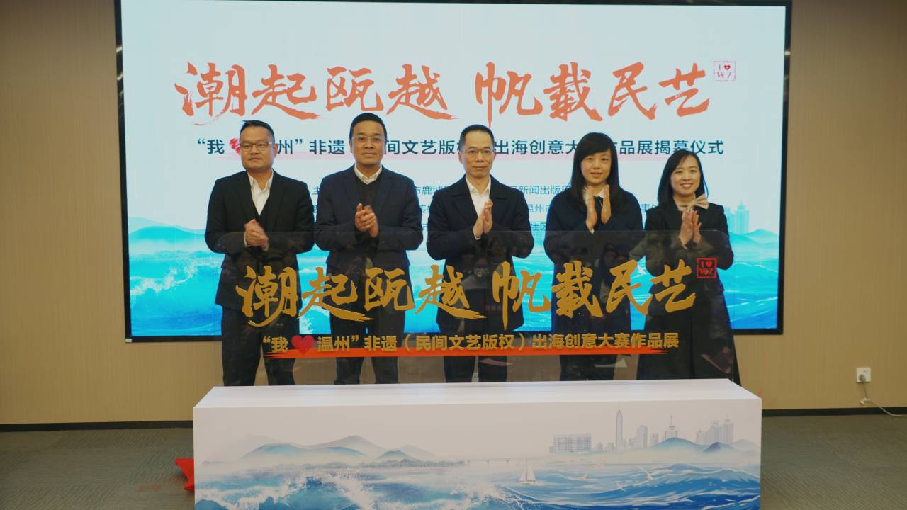 潮起瓯越,帆载民艺。12月10日,“我爱温州”非遗(民间文艺版权)出海创意大赛作品展在温州版权馆揭幕。揭幕仪式由鹿城区委宣传部主办,温州理工学院、温州商学院、五马街道共同承办。市委宣传部副部长黄朝钦,鹿城区委常委、宣传部部长叶恒坚出席揭幕仪式。