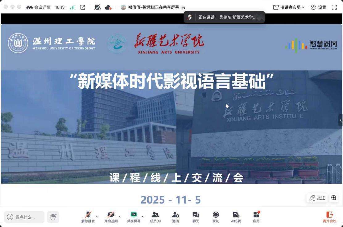 值得一提的是,温州理工学院近年来持续开展与新疆多所高校的线上教学合作,积累了丰富的跨域协同经验。本次公开课团队积极借鉴校内以往“慕课西行”项目的成功做法,进一步优化协同流程。温州理工学院陈畅老师、凌心卉老师与新疆艺术学院吴艳东老师紧密协作,打破空间限制,实现资源互通、优势互补,为高质量同步课堂打下坚实基础。